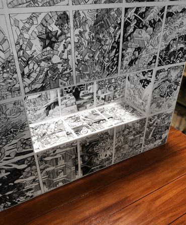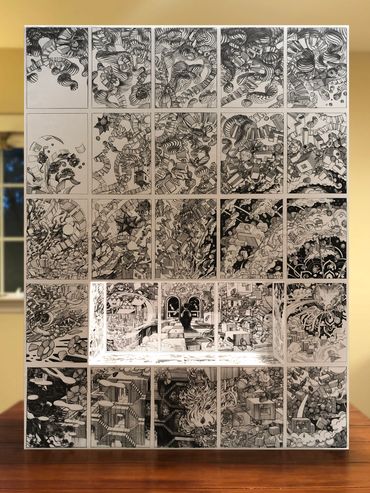 The Black series developed from my fascination with geometry, puzzles, and details. As a child, I was a big fan of Tetris, Where's Waldo, and Lego. As an adult, this series works towards addressing deeper concepts that concern me. I feel this work is a reconciliation of my younger self with my adult self. In contemplation it calls out a nostalgia that reminds me of what was once fun.